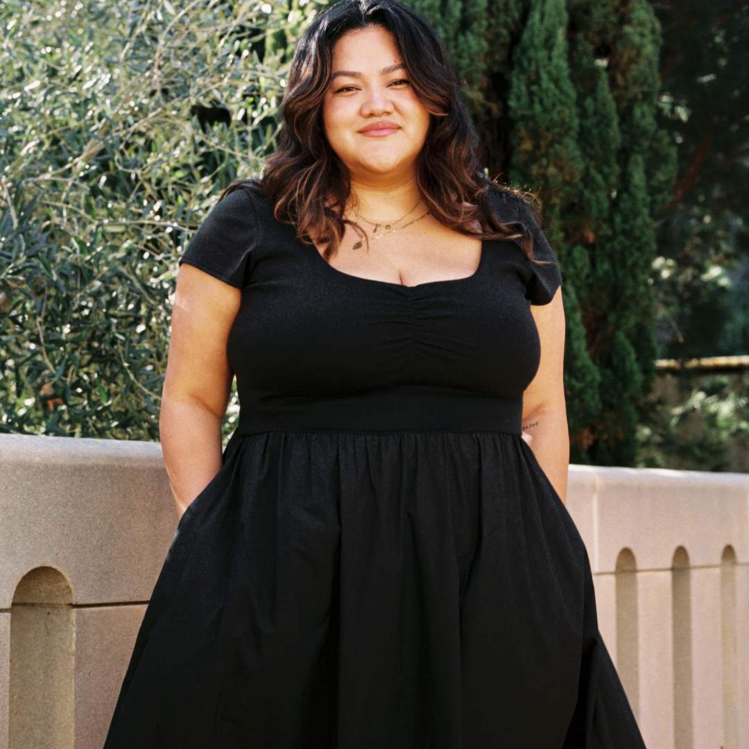 - The bodice is made in an interlock knit fabric for a fitted look